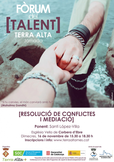 El proper dimecres, 16 de novembre a l’Església Vella de Corbera d’Ebre de 15.30 a 18.30 h us convidem a la 3a jornada del Fòrum del [Talent], on parlarem de “Resolució de conflictes i mediació” amb el contingut següent: