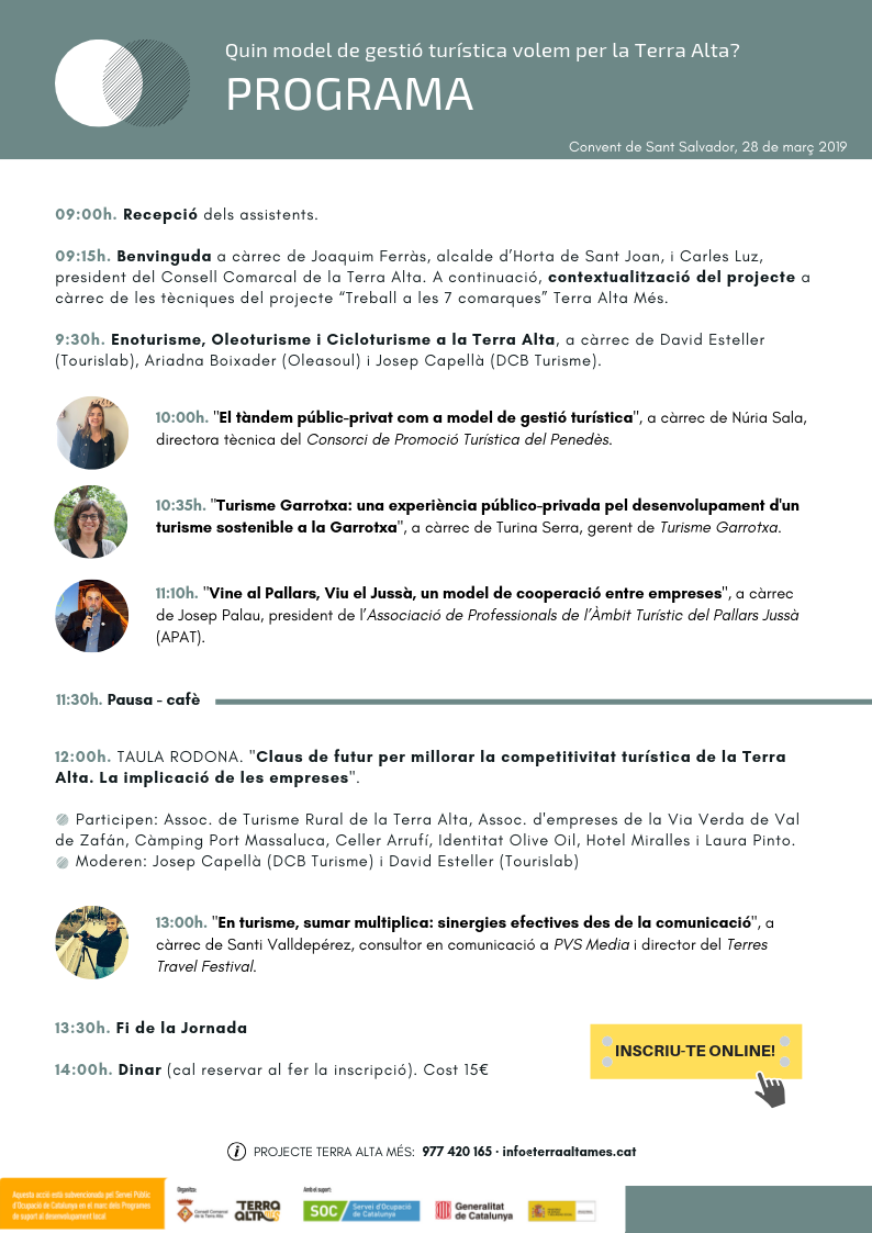 El proper dijous 28 de març, en el marc del projecte “Treball a les 7 comarques”, Terra Alta Més organitza una Jornada Professional adreçada al sector turístic de la Terra Alta per conèixer diferents models d’èxit de gestió turística a Catalunya i debatre sobre elements que podrien ser d’interès pel futur turístic de la comarca. La Jornada tindrà lloc al Convent de Sant Salvador, a Horta de Sant Joan, de les 09:00h del matí a les 13:30h del migdia.