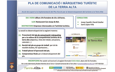 El dilluns 19 d'octubre, a les 16.00 h, tindrà lloc al Restaurant Can Josep de Bot l'acte de presentació del Pla de comunicació i màrqueting turístic de la Terra Alta. [...]